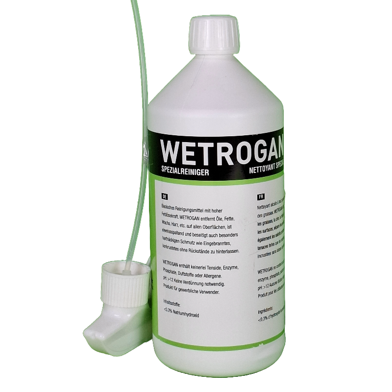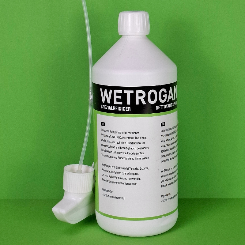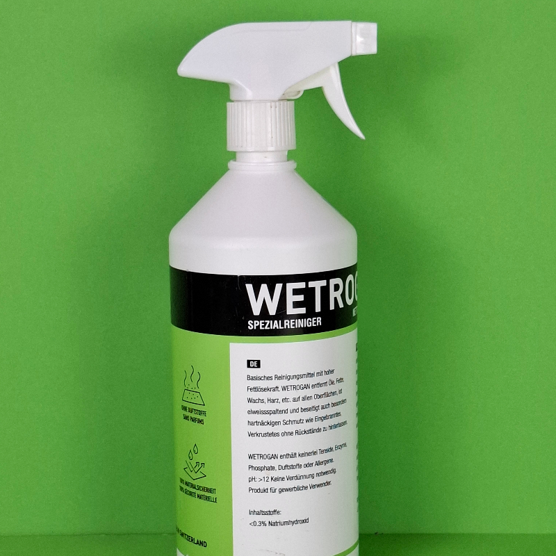 Wetrogan Spezialreiniger entfernt Öle, Fette, Wachs, Harz, etc. auf allen Oberflächen. Der Spezialreiniger ist eiweissspaltend und beseitigt auch besonders hartnäckigen Schmutz ohne Rückstände zu hinterlassen.