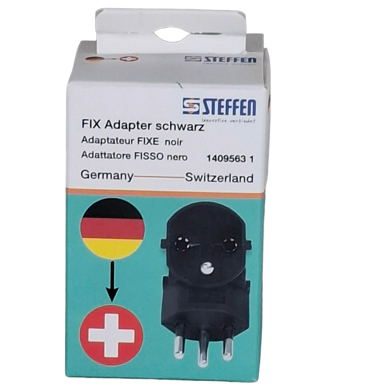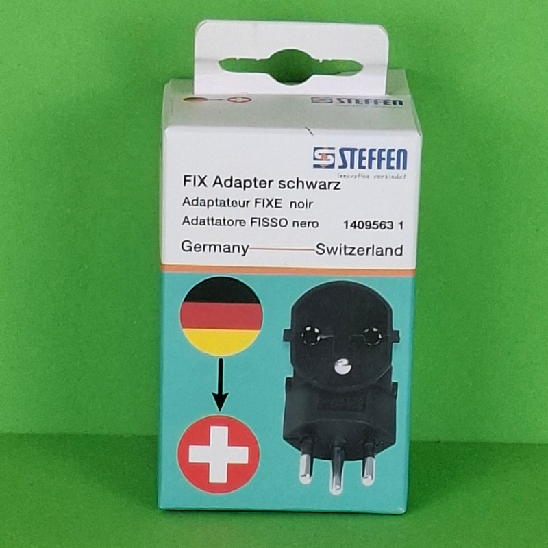 Adapter EU – CH zur Anpassung eines europäischen Steckers auf eine schweizer Steckdose.